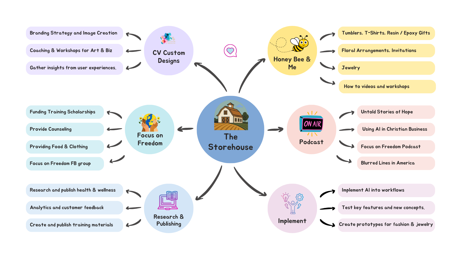 Every income stream from CV Custom Designs begins with The Storehouse. The first portion of every sale, commission, class, or resource is set aside to fund: